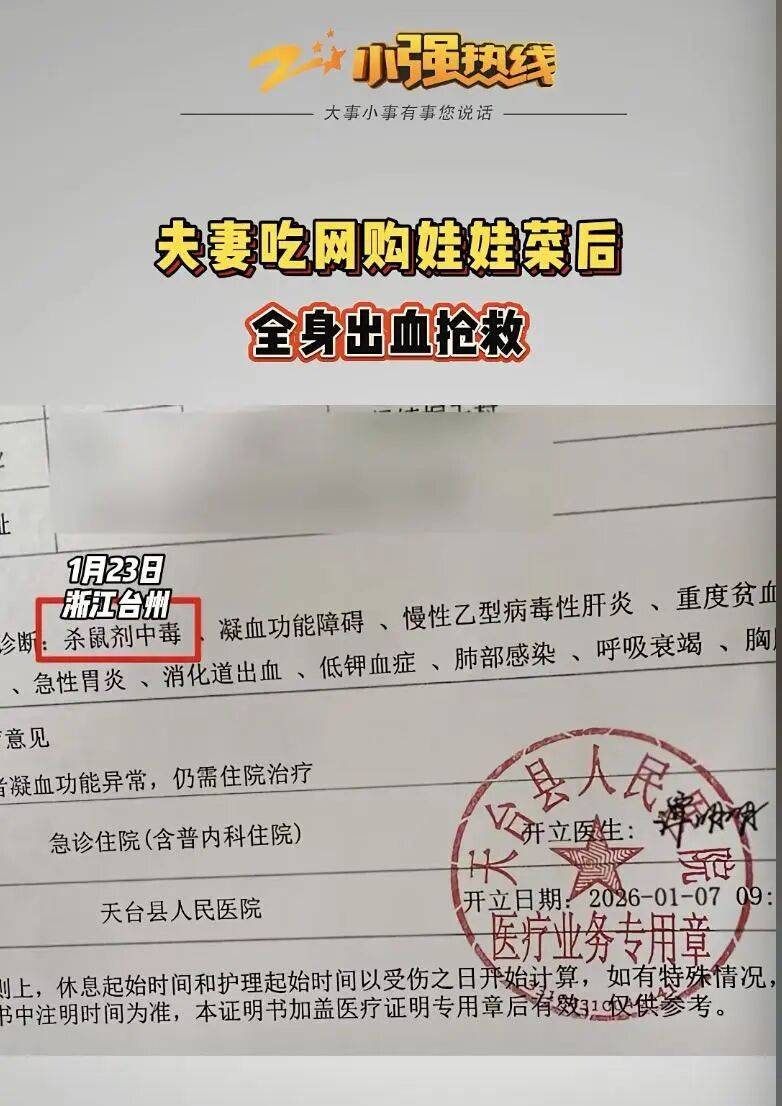 2025年12月网购娃娃菜台州天台县杨密斯和丈夫于,展现全身出血症状食用后鸳侣俩同时,调停入院。结果显示病院诊断,老鼠药中毒鸳侣俩均为,均检测出杀鼠剂因素杨密斯和丈夫血液中。娃菜中检测出老鼠药随后警方也正在网购娃,受案并。